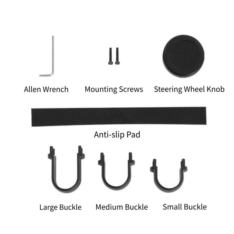 Accessories Includes: 1 x Steering Wheel Knob + 1 x Anti-slip Pad +1 x Allen Wrench + 2 x Mounting Screws + 1 x Large